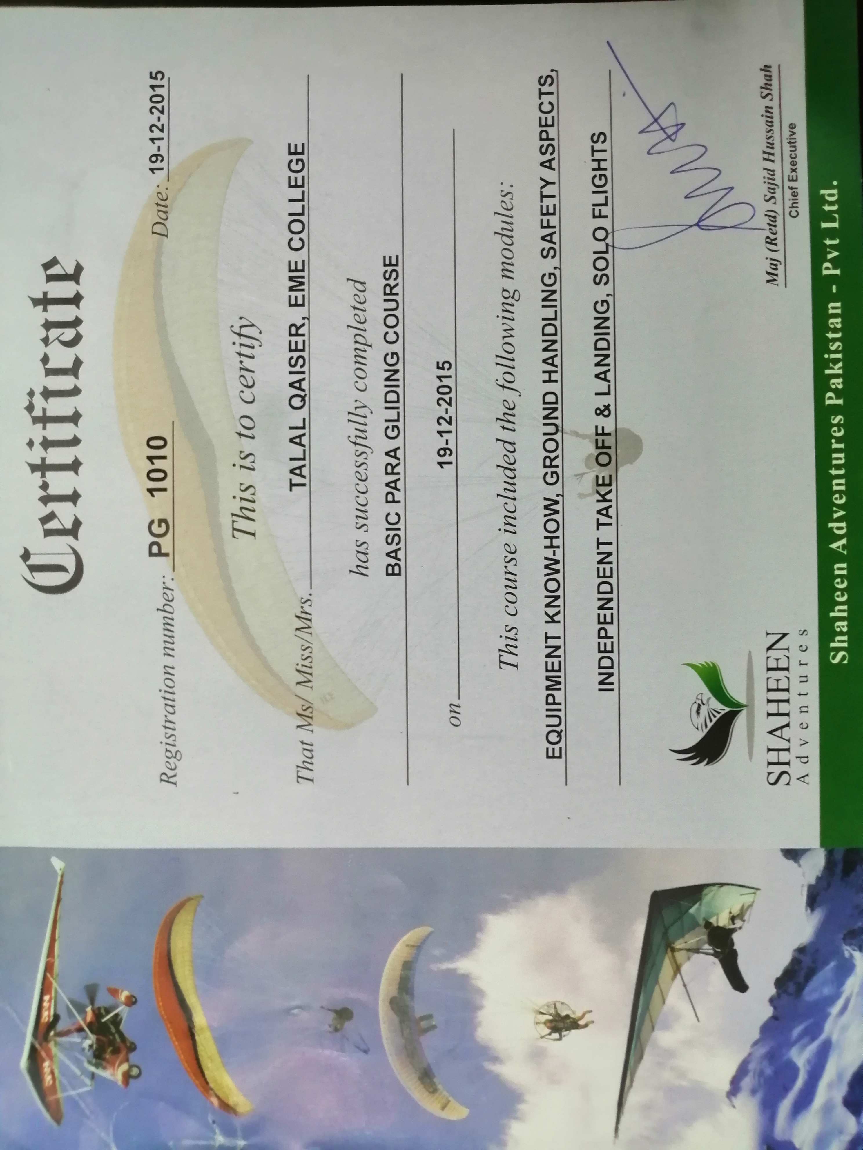 Paragliding is a type of recreational aviation that involves gliding through the air while suspended in a lightweight, free-flying, foot-launched aircraft known as a paraglider. I have earned a beginner level certificate in paragliding. Thats me in the picture
